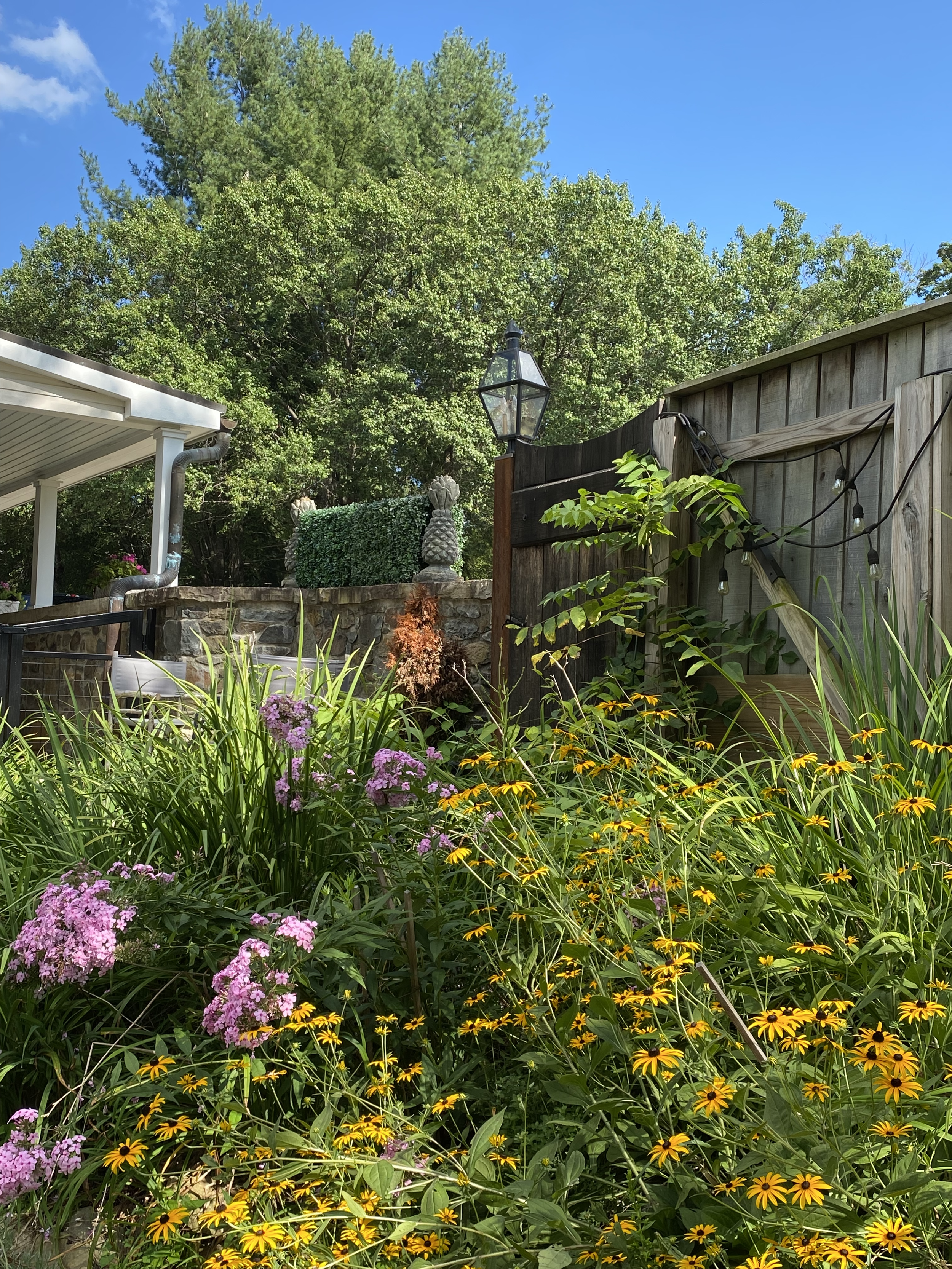 Mix of 6 ft+ stone and wood privacy fencing and 4 ft wood + wire fencing. Watch determined escape artists around the wire part of fences and tightly secure the gate to avoid gaps for small dogs. We parked our car right against it so there was no chance of Ginger squeezing through.
