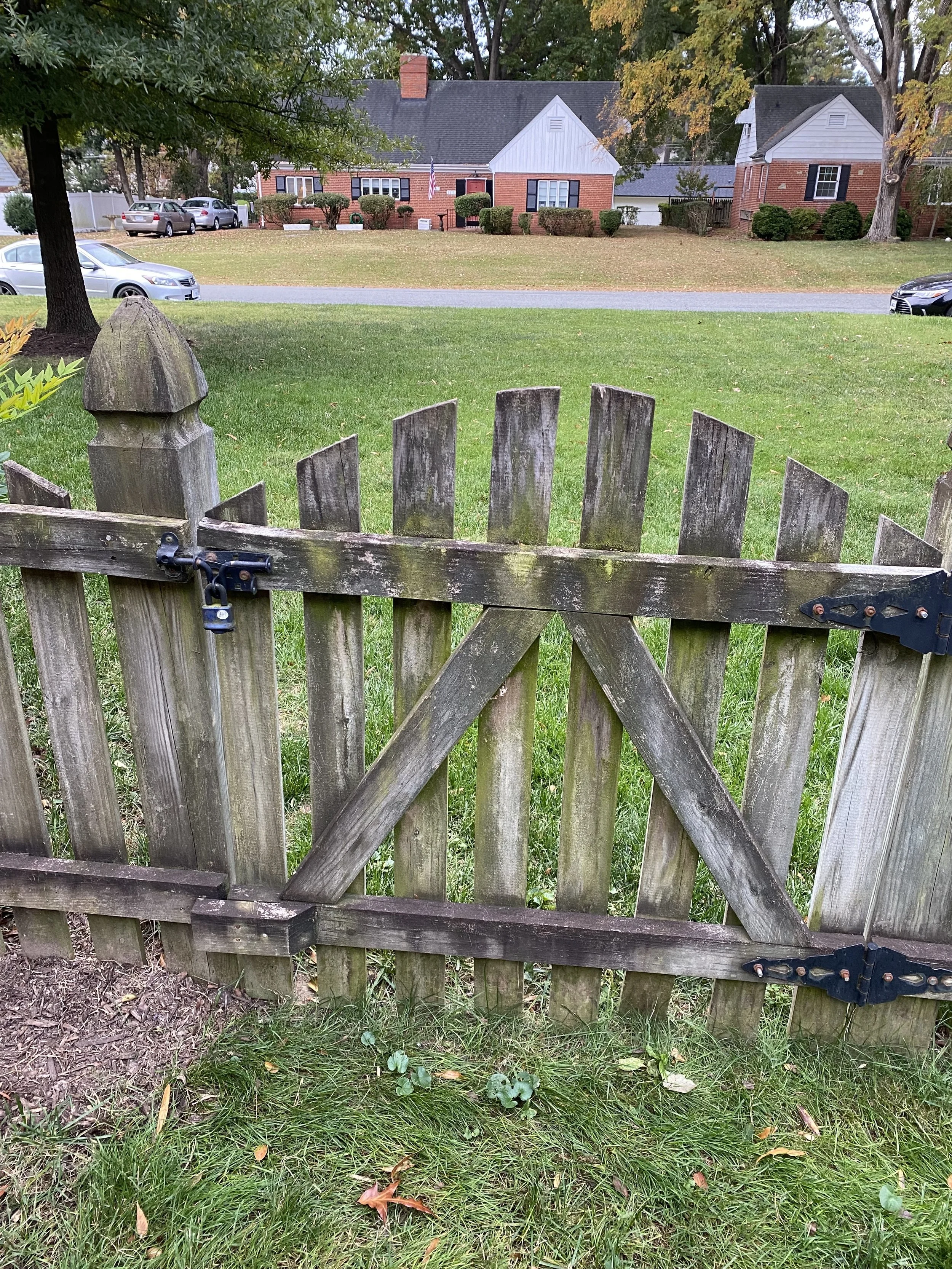 Large grassy yard surrounded by 3ft picket fence. Keep an eye on athletic or escape artist dogs who could jump and make a run for it.
